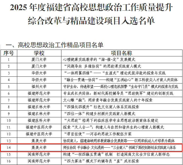 近日,中共福建省委教育工委公布2025年度福建省高校思想政治工作质量提升综合改革与精品建设项目入选名单,我院申报的项目《师生协同 平台融合 文化浸润——三全育人视域下高校创新创业实践育人体系的模式探索》(负责人:院党委书记 陈娟)入选高校思想政治工作精品项目。