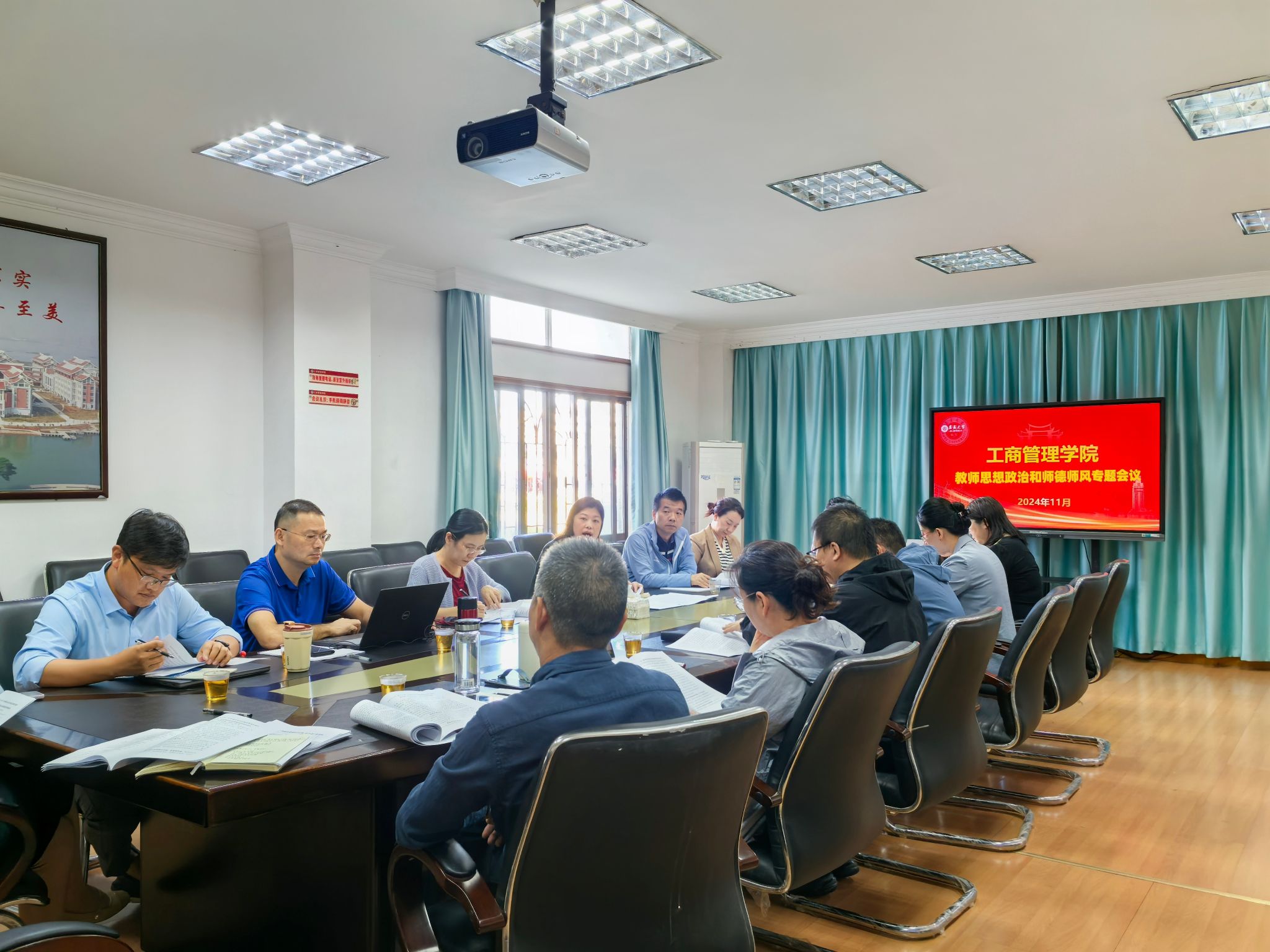 近日,工商管理学院于学院一楼会议室召开教师思想政治和师德师风专题会议,院领导、各系主任、各科室负责人、党支部书记、全体辅导员参会。