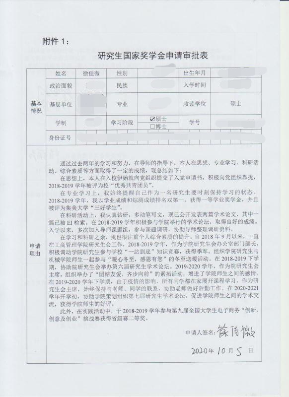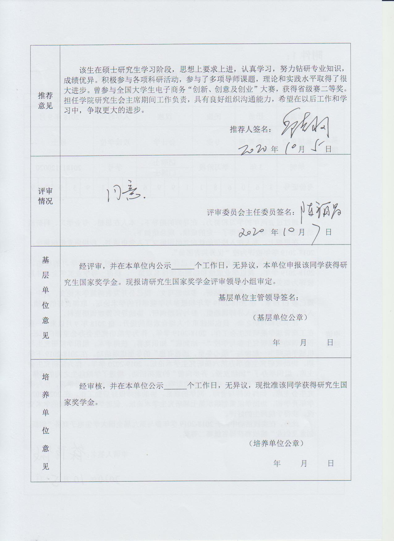 根据《关于开展2020年研究生国家奖学金评选工作的通知》,经发布通知、学生申请、学院研究生奖助学金评审委员会资格审查和评审推荐、学院党政联席会议审定,拟推荐徐佳微参评2020年研究生国家奖学金,特此公示。