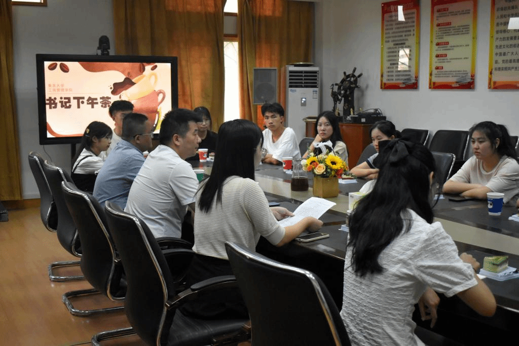 9月14日,工商管理学院开展“书记下午茶”暨“同心·同行”就业创业工作座谈会。工商管理学院党委副书记董欣胜、校友代表、学院辅导员以及院学生就业创业会学生干部代表、创新创业学科竞赛获奖团队代表参与本次活动。