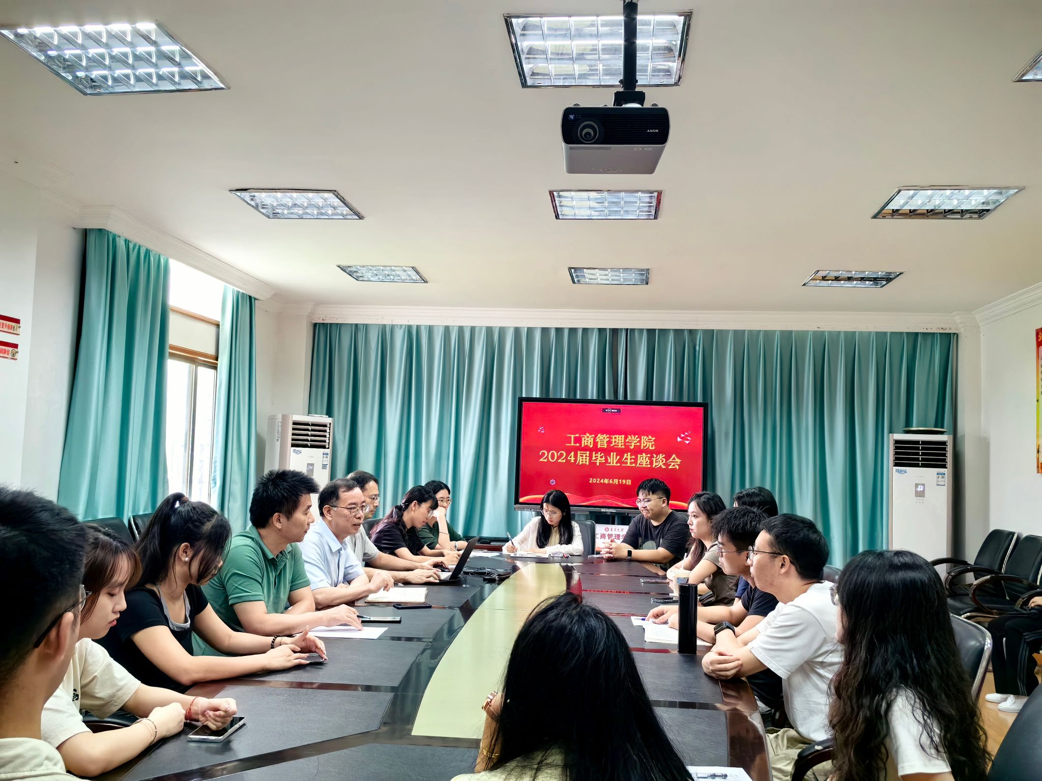 6月19日下午,工商管理学院在学院一楼会议室召开2024届毕业生座谈会。院长邱吉福、院党委副书记董欣胜、副院长吴江秋,教学办、毕业班辅导员及2024届毕业生代表参加会议。