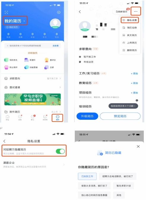 参加线上双选会学生,如不希望简历被企业方搜索查看,可通过以下步骤选择原因隐藏简历。隐藏后的简历仅主动投递时可被查看。