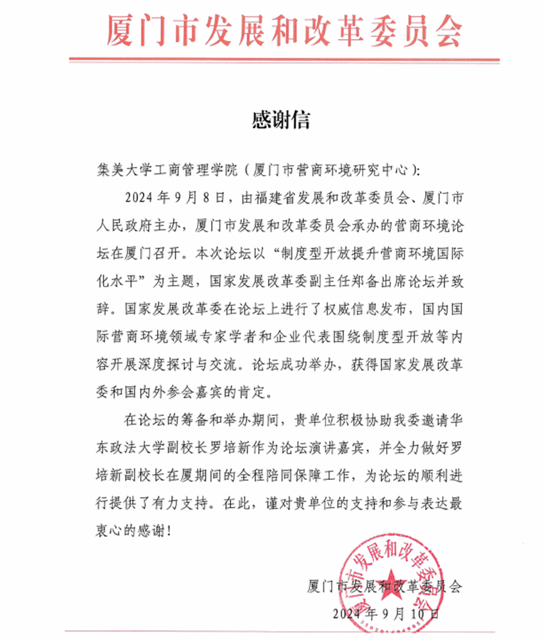 近日,厦门市发展和改革委员会向我校工商管理学院发来感谢信。来信中,市发改委对工商管理学院在第二届营商环境论坛举办中给予的大力支持表示感谢。![]()