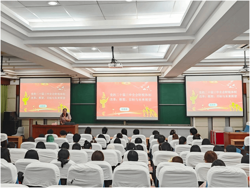 学院学习贯彻党的二十届三中全会宣讲团成员、工商管理教研室党支部杨春娇副教授以《党的二十届三中全会财税体制改革:框架、目标与未来展望》为主题,她从党的二十届三中全会提出的深化财税体制改革为切入点,围绕新一轮财税体制改革回应社会新形势、财税体制改革总体框架、财税体制改革目标与未来展望等三个方面展开,她提出,学院党员、入党积极分子要认真学习领会党的二十届三中全会精神,深刻认识深化财税体制改革的重要意义。