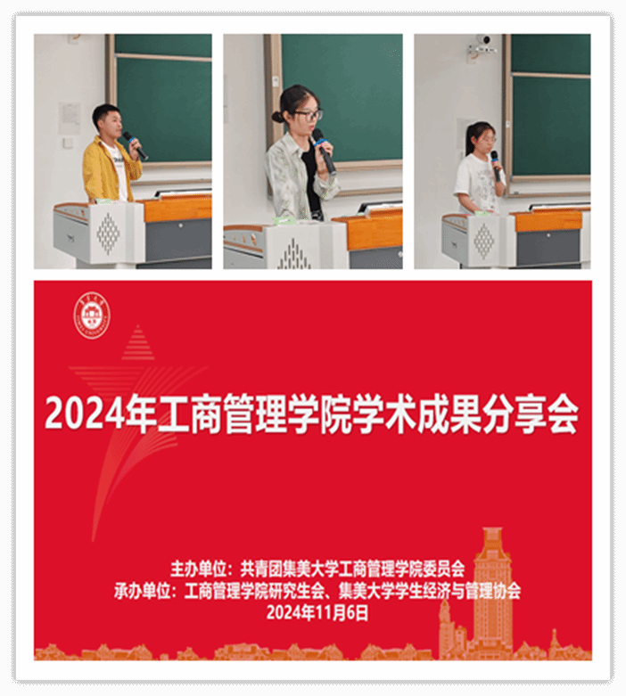 为进一步强化优秀研究生在朋辈中的引领与榜样作用,促进本硕学生之间的经验交流与共享。11月6日下午,工商管理学院在集毅楼B308教室成功举办了一场学术成果分享会。集美大学学生经济与管理协会(白鹭学习社)审计学系副主任马正凯老师、研究生辅导员、全体研究生和部分本科生代表参加了会议。2022级工商管理专研究生李可可、雷彤彤、王云龙进行了学术成果分享。