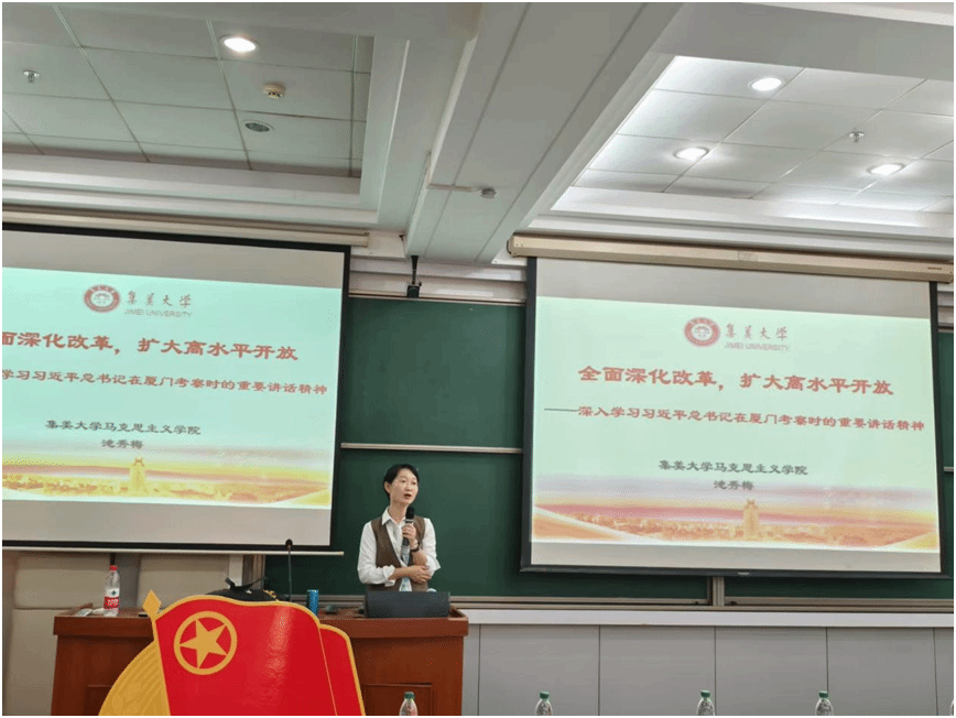 马克思主义学院教研室主任池秀梅老师应邀为青年团员讲授《全面深化改革 扩大高水平开放——学习习近平总书记在福建考察时的重要讲话精神》。她重点讲述厦门以综合改革试点推进全面深化改革,高标准谋划和实施一批战略性、创造性、引领性改革,以更多首创性、突破性、标志性改革成果,为推进中国式现代化探索试验、探路先行。她鼓励团员青年要学习宣传贯彻习近平总书记在福建考察时的重要讲话精神,在思想和行动上同党中央保持高度一致,不断提升自己的政治觉悟和理论素养。