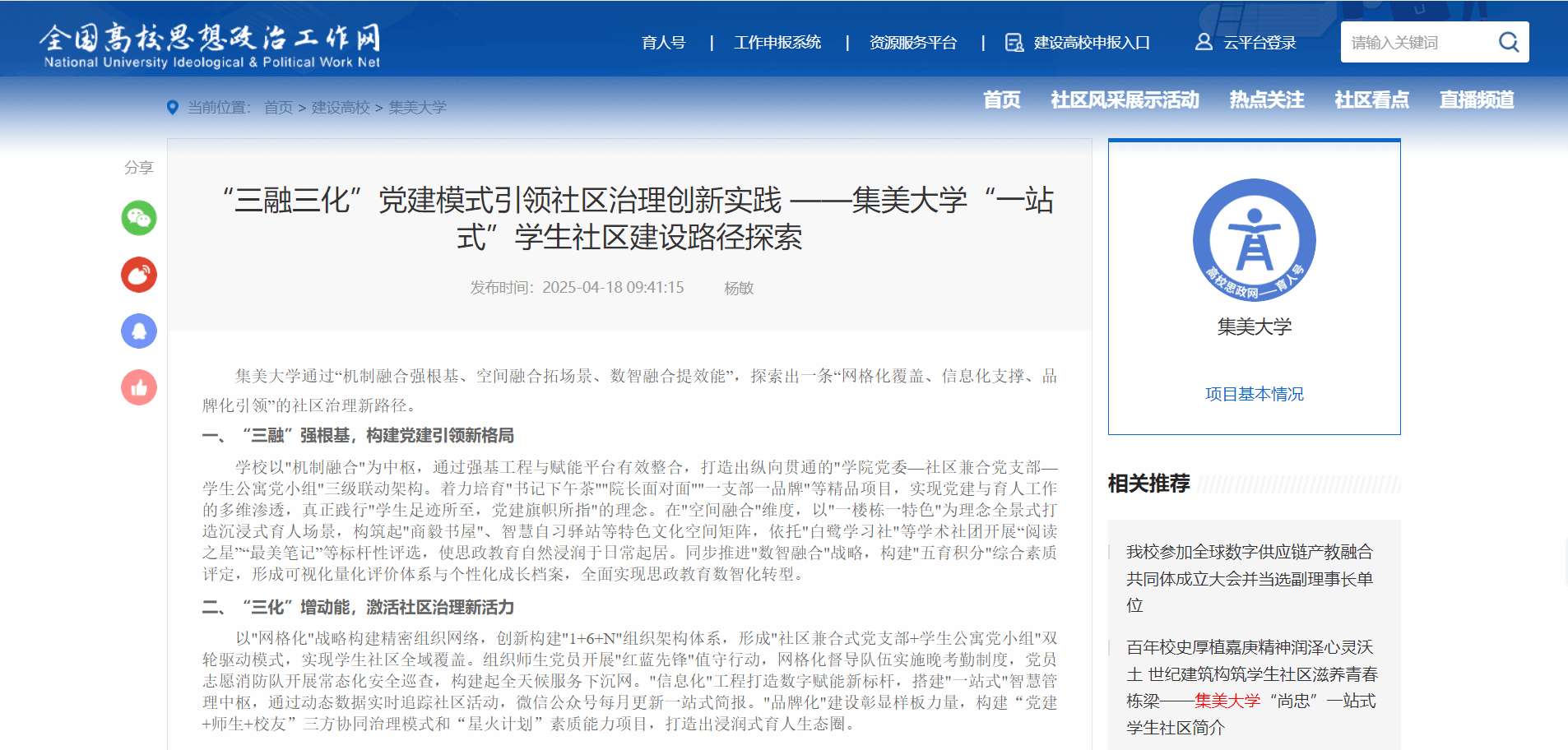 全国高校思想政治工作网:“三融三化”党建模式引领社区治理创新实践——集美大学“一站式”学生社区建设路径探索 https://yurenhao1.sizhengwang.cn/a/jmdx/250418/2092372.shtml
