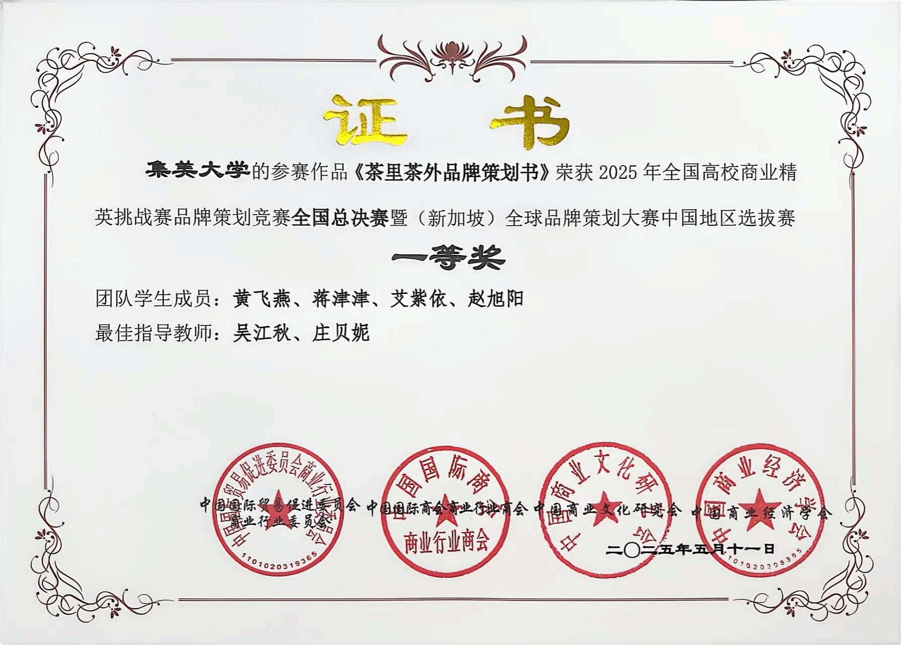 在产教赛融合方面,学生团队积极参与华祥苑品牌策划项目,围绕“茶文化赋能品牌升级”展开调研,提出“国茶文化IP矩阵”战略,形成华祥苑茶品牌年轻化策划案和“茶里茶外”子品牌,获得企业认可并获得授权代表华祥苑参加2025年全国高校商业精英挑战赛品牌策划竞赛,荣获全国总决赛一等奖。同时,华祥苑也荣获“产教融合项目优秀企业奖”,充分体现了校企合作的示范效应。