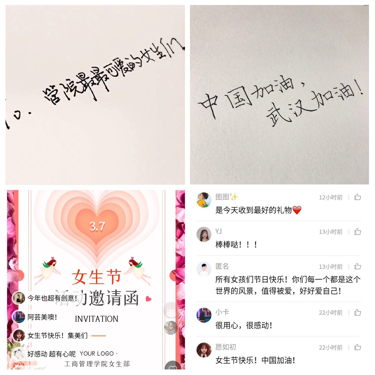 为丰富我院学生校园文化生活,形成尊重女性、关爱女生的和谐氛围,3月7日,工商管理学院开展以“最好的礼物”为主题的线上女生节祝福活动。