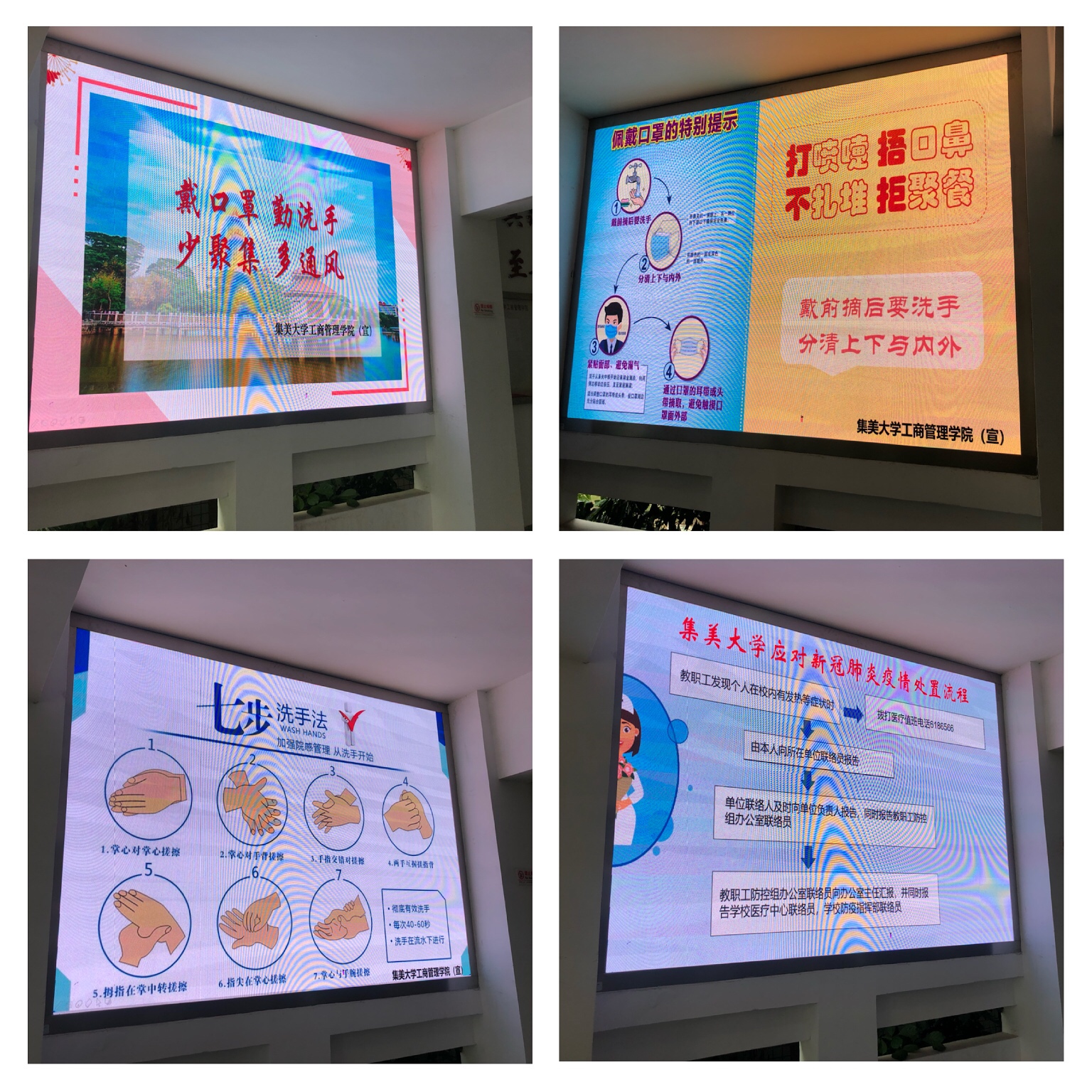 学院利用门厅电子屏幕滚动播放疫情防控常识、学校应对新冠肺炎疫情处置流程等宣传海报和标语,提高学院教职工疫情防控意识和能力。辅导员第一时间将情况告知相关学生,线上跟进相关学生的动向摸排和心理疏导工作。学院还将在学生宿舍区域增设防疫知识宣传海报,为应对学生返校复学做好准备。