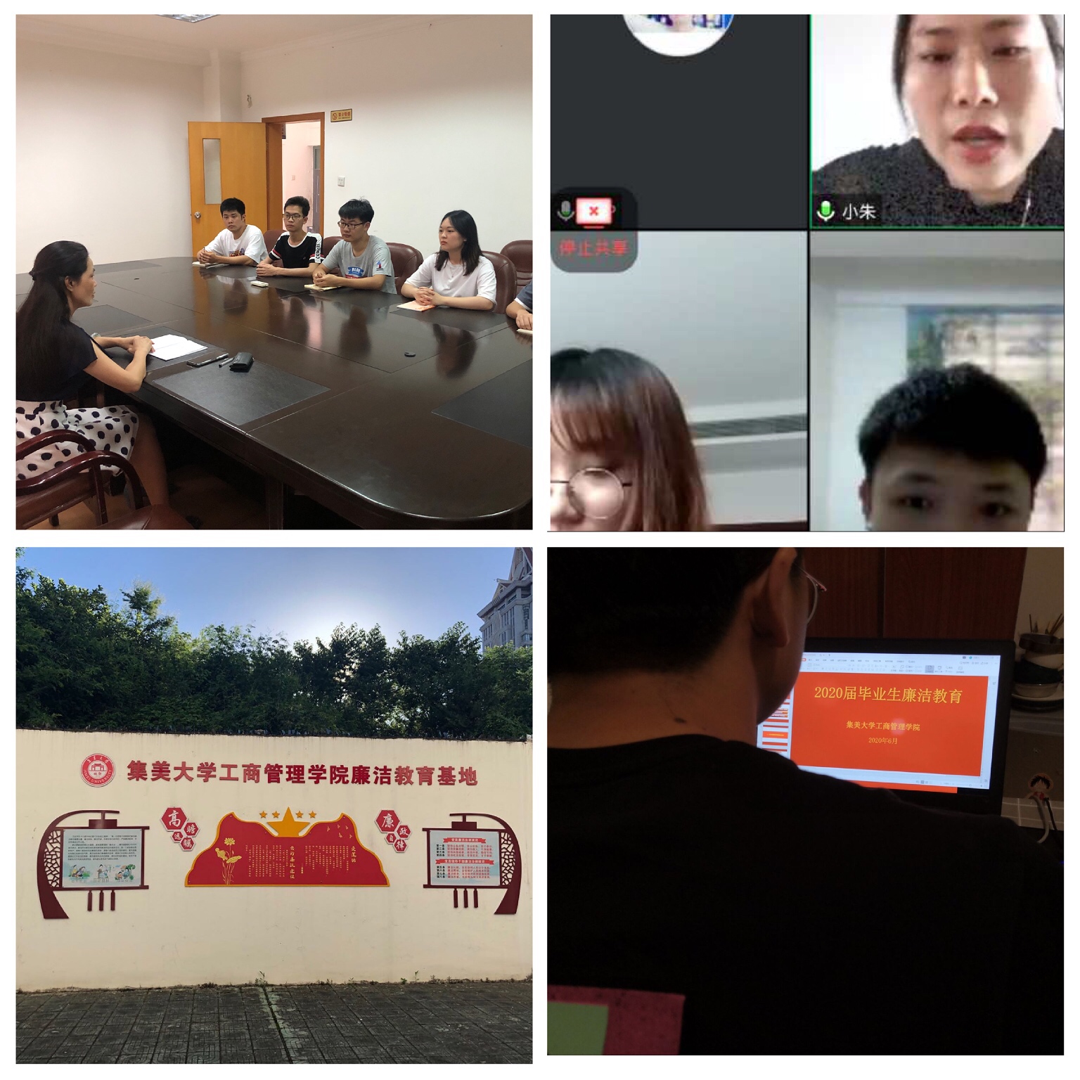 毕业班全体学生通过线上参会的方式,举办廉洁主题系列活动,包括组织毕业班班会、廉洁入职教育课、廉洁教育座谈会,线上观看廉洁教育宣传片,发放《廉洁教育倡议书》,云参观学院廉洁教育基地,为2020届毕业生上好离校前的“最后一课”。