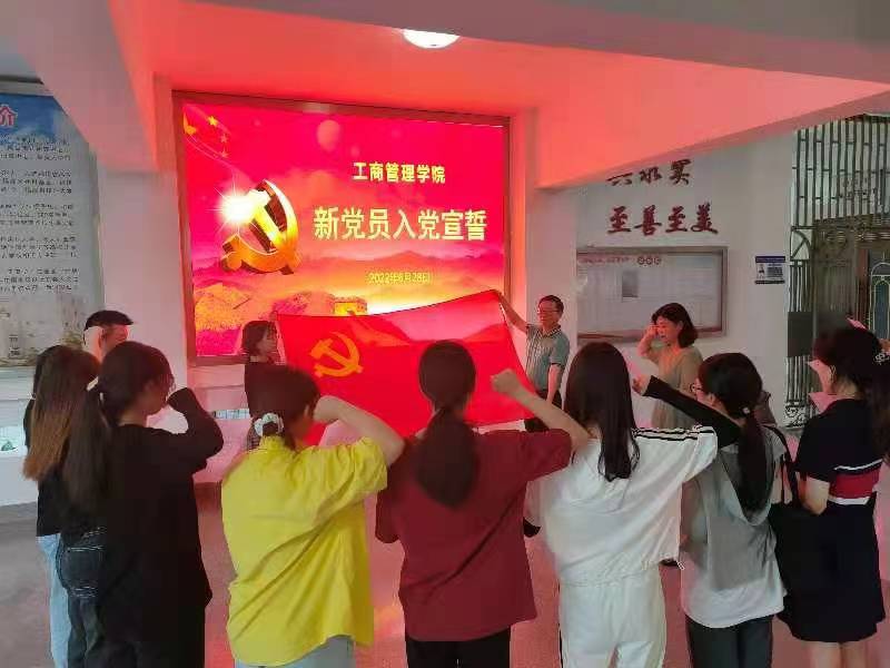 “我志愿加入中国共产党......永不叛党”,铿锵有力的誓词在工商管理学院响起。6月28日下午,在学院党委书记陈娟的领誓下,新党员参加入党宣誓活动。新党员们面向党旗、举起右拳,庄严宣誓,许下作为中国共产党员最铿锵有力的承诺,以饱含激情、坚定有力的宣誓,表达不忘初心、砥砺奋进的决心。陈娟书记希望新党员同志们要在对党忠诚上作表率、在理论学习上作表率、在担当尽责上作表率、在为民服务上作表率、在严守纪律上作表率,用实际行动践行诺言,为党徽党旗增光,为党和人民事业添彩,永不愧于共产党员的光荣称号,以更优异的成绩迎接党的二十大召开。