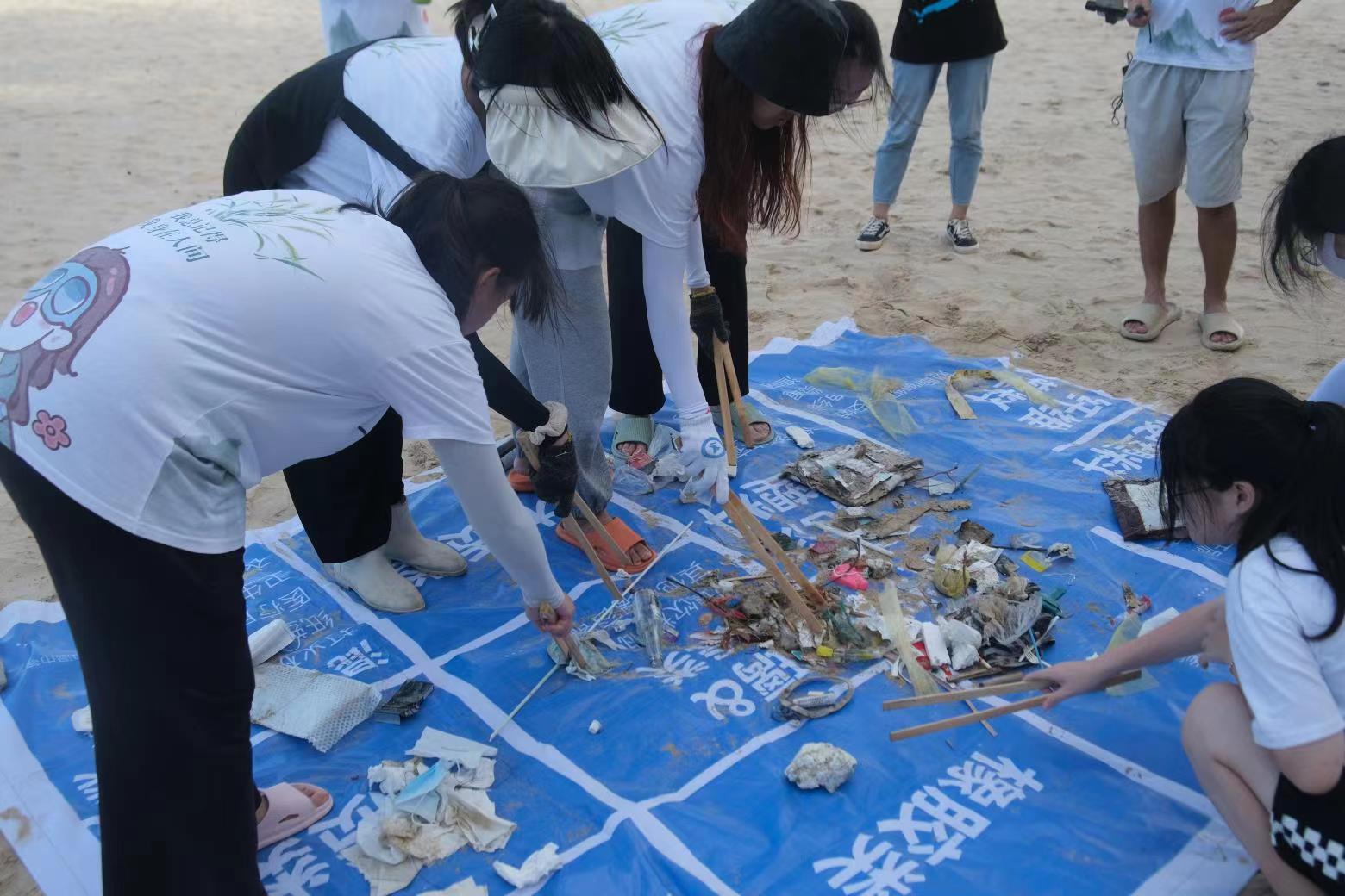 在活动现场,10名大学生手持垃圾袋,捡拾散落在沙滩上的饮料瓶、吸管、烟盒、玩具、泡沫、渔线等垃圾,共计捡拾垃圾9公斤,并对海滩垃圾进行一一分类。