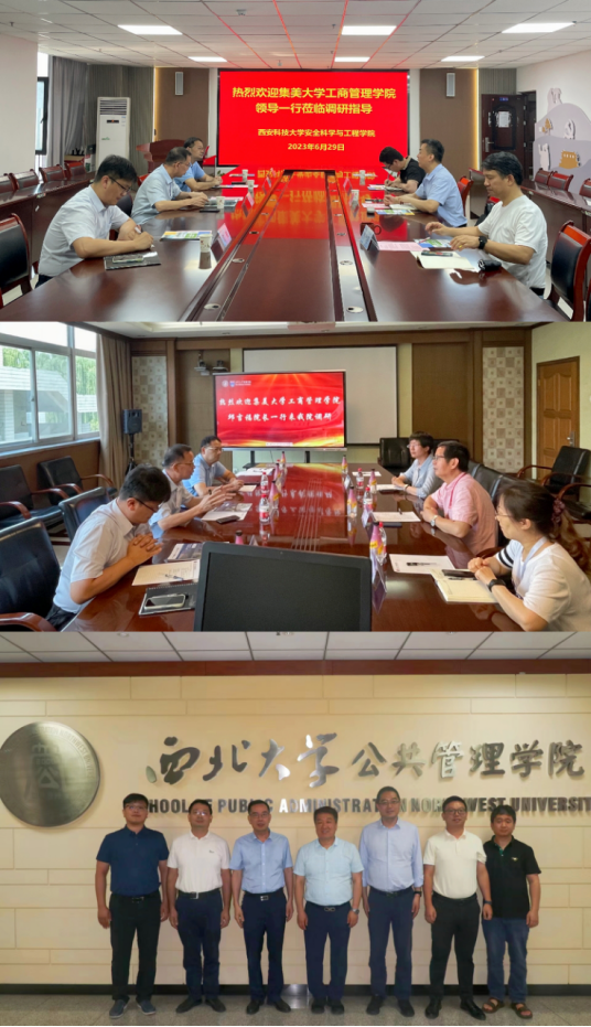 2023年6月29日至6月30日,工商管理学院邱吉福院长、吴江秋副院长(挂职)、工商管理系副主任江航、院办负责人等一行4人先后走访西安科技大学安全科学与工程学院、西安交通大学管理学院和西北大学公共管理学院(应急管理学院),开展对外学术交流和调研学习。