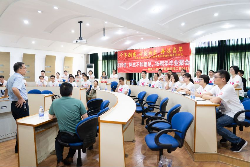 在工商管理学院大楼前,他们在签到展板上留下了自己的名字,与老同学,曾经授课的老师们合影留念。此时此刻,仿佛时间又回到了过去,往昔的友情、师生之情伴随着一阵阵回忆涌上心头,留下了一串串难以言表的情感。紧接着,班级组织了一场座谈会,在学院教学楼b103教室内举行,他们在班长的组织下,分享了这几年他们步入社会后的酸甜苦辣,有些老同学已经生儿育女带上了自己的后代,他们戏称:还是校园生活轻松啊。在座谈会上邱吉福院长、董欣胜党委副书记等老师和校友们同聚一堂,再叙师生情谊,畅谈校园故事,重温同窗岁月。