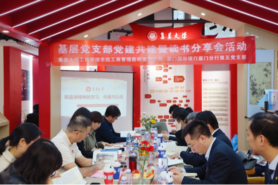 12月6日,集美大学工商管理学院工商管理教研室党支部与厦门国际银行厦门分行第五党支部联合举办党建共建暨读书分享会活动,聚焦党建引领基层治理,统筹运用双方党建资源,深化银校合作关系,推动银校共建、共享、共治。厦门国际银行厦门分行党委副书记、纪委书记黄仕志,厦门分行第五党支部书记苏艳,厦门集美新城支行行长胡军伟,集美大学工商管理学院党委书记陈娟,工商管理教研室党支部书记陆晓倩,工商管理教研室党支部党员等20余人参加活动。