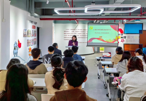 3月6日下午,工商管理学院党委书记陈娟在集友三“一站式”学生社区中心讲授开学第一课,院党委副书记董欣胜、全体辅导员、全体学生党员参加党课。